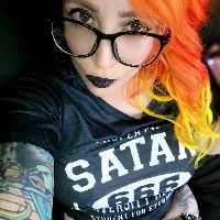 Brown eyes, bright orange hair, DDD boobs, chubby waist, tattooed.