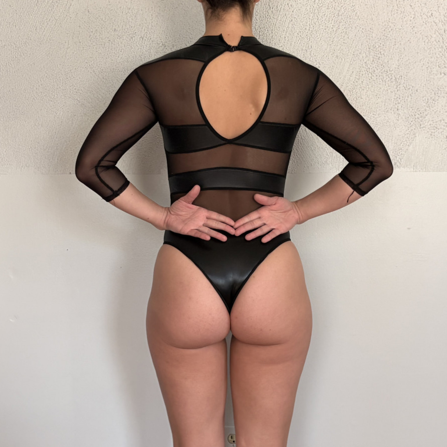 mesh bodysuit with faux leather horizontal sections. Wore this a few times in a few different public videos